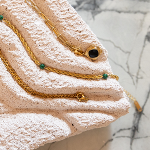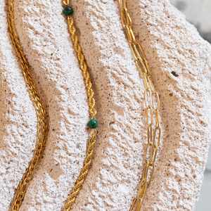 This captivating rope chain features an array of stunning green charms, exuding a sense of natural allure and sophistication. Embrace the vibrant hues and elevate your neckline effortlessly with this unique piece. Let your style resonate with the freshness of nature, showcasing an essence of charm and grace. Make a statement with each charm as you infuse your look with a touch of verdant sophistication