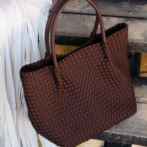 Meet the Woven Neoprene Winona Tote in Chocolate; the perfect balance of polished and practical. Spacious, structured, and effortlessly chic, it’s designed to handle full days while still looking refined.